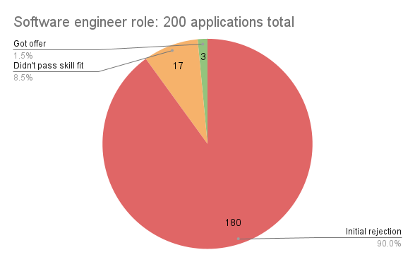 Looking at this example, if you blindly apply to position in software that is somewhat relevant, your chance of getting hired is 2/200, or 1%. Good luck with that.